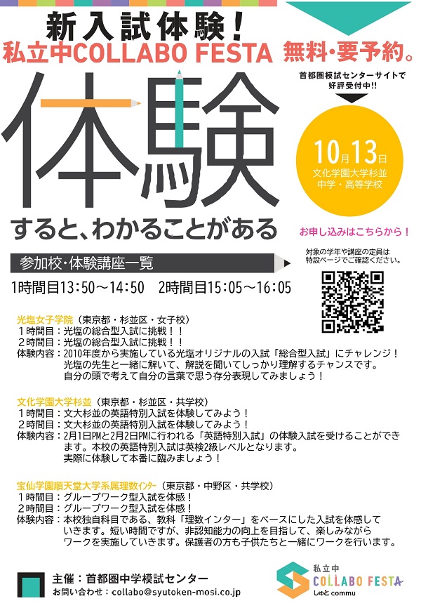 中学受験を検討中の小学5・6年生の保護者の方へ、お勧めイベントの紹介です。首都圏模試センターによる「新入試体験!私立中コラボフェスタ」が10月13日(日)に文化学園大学杉並中学校にて開催されます。このイベントでは、私立中学の英語入試、総合型入試、そしてグループワーク入試を「体験授業」として直接体験できます。