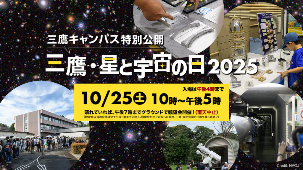 国立天文台、自然科学研究機構アストロバイオロジーセンター、東京大学天文学教育研究センター、総合研究大学院大学天文科学専攻による特別公開イベント「三鷹・星と宇宙の日」が、10月25日(土)に「三鷹キャンパス」にて開催されます。