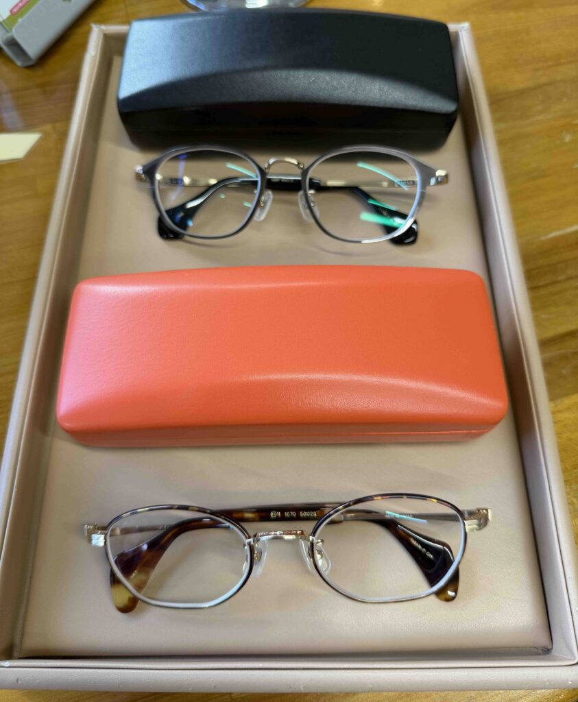 新しい眼鏡は、どちらもゴールドのアクセントが効いたおしゃれなフレームを選びました。写真では伝わりにくいかもしれませんが、とても気に入っています。