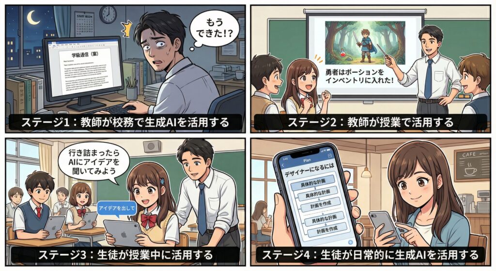 AI教育の4ステージについて漫画で解説してもらったのがこちら。日本語の違和感がほとんどなくなっていることがわかります。