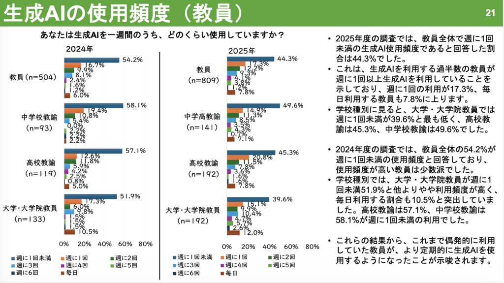 「ついに半数を超えた」——そう感じた方も多いと思います。私も講演や研修の依頼が2025年度から明らかに増えており、教育委員会・学校レベルで生成AIの活用を本格的に進める意志を強く感じています。