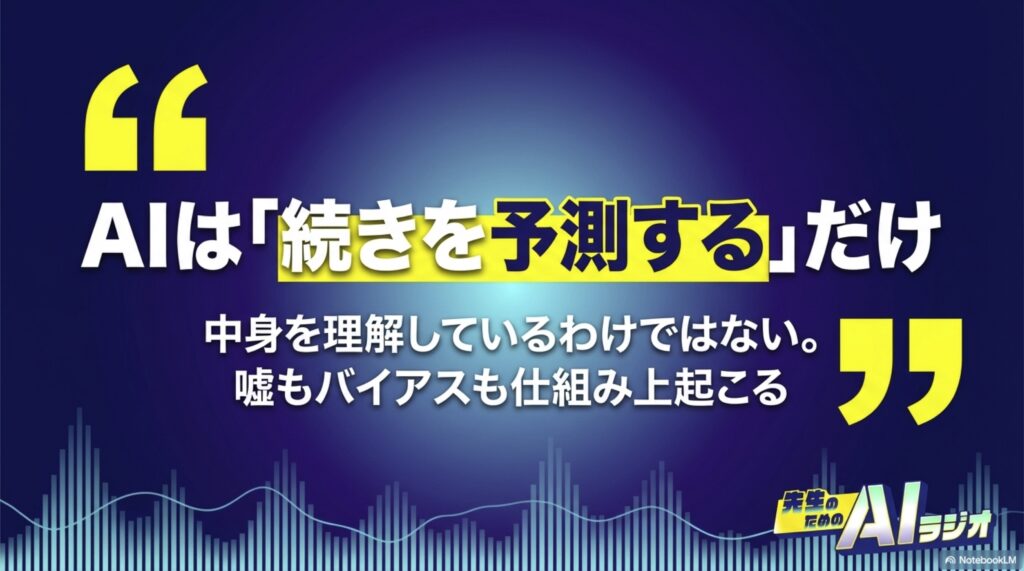 こうしたバイアスの存在を知っておくことは、AIを授業で活用する際の重要な前提になります。