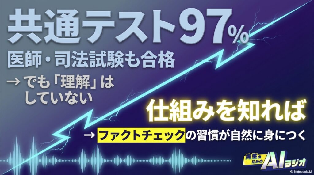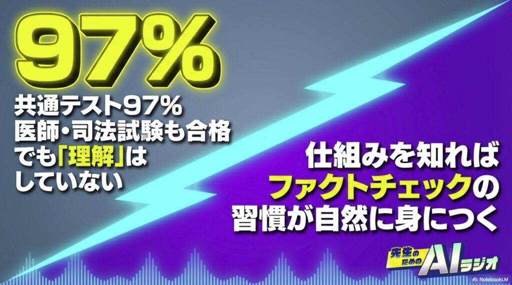 共通テスト97%、医師免許試験や司法試験にも合格できる性能を持つAI。これだけ賢いと、当然中身を理解していると思ってしまいます。しかし、その賢さと「理解」はまったく別のものなのです。